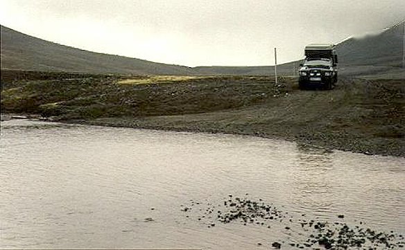Schon kurz nach Einfahrt auf die Piste wird uns klar, warum diese Strecke als neue Hochlandpiste aufgeführt wird: Ein übel aufgeschütteter "Bahndamm" mit typischen Waschbrettmustern erwartet den Explorer - ein erster Vorgeschmack zwar nicht auf typisch isländische Piste, aber doch auf unangenehmen Untergrund.