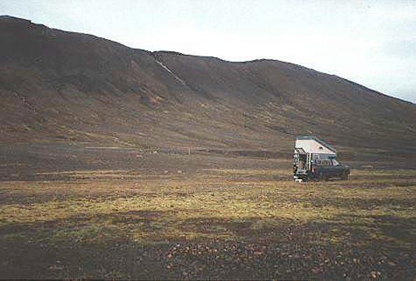 Ein einsamer Scamper-Pickup und zwei bis drei verstreute Fahrzeuge bilden den "Campingplatz" neben der Hütte, dahinter nur der verhüllte Snaefell mit pitoreskem Panorama, der nur wenige Kilometer entfernte nördliche Gletscherrand des Vatnajökull ist nur am kalten Windhauch zu erkennen ...