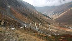Was nun? Wir rätseln hin und her und ich beschließe, dass wir der zweiten Tafel Glauben schenken und weiterfahren dürfen, da ja auch kein Schnee liegt. Prompt kommt uns mitten im ersten Serpentinenblock ein Disco III mit einem Schweizer Pärchen entgegen, die ganz freudig den Daumen nach oben recken, als sie uns passieren. Also alles ok, denke ich und wir fahren weiter.