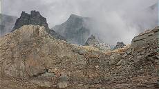 Die Landschaft ist beeindruckend und die bedrohlich wirkenden Wolkenfetzen verstärken die schroffen Felsformationen um uns herum. Die Gletscherreste bieten jedoch ein eher trauriges Bild und bei 7°C sowie eisigem Wind ist es alles andere als gemütlich. Aber wir stehen ja schließlich Ende September auf 3.000 Meter Höhe!