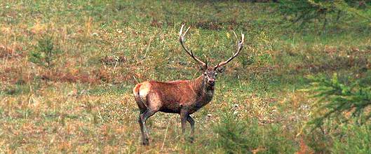 Nachdem wir die erste Talstufe erreicht haben, fahren wir wesentlich entspannter bergab. Wie schon bei der Auffahrt sehen wir Jäger bei der Beobachtung von brünftigen Hirschen am Straßenrand stehen. Wir halten auch kurz an und hören - nichts. Also fahren wir weiter und tatsächlich, auf Höhe des Stausees, läuft uns ein kapitaler Hirsch vors Auto. Ich halte sofort an und lasse die Scheibe herunter, um noch ein Foto zu erwischen. Leider zeigt er mir nur sein Hinterteil und ich versuche mich als Tierstimmen-Imitator. Nach meinem dilettantischen Röhren dreht sich der Zehnender tatsächlich nochmal um und lächelt in die Kamera ...