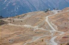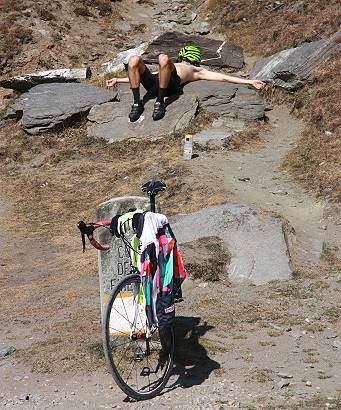 Die werden jedoch echt anstrengend: Jede Menge gröbster Schotter und viele spitze Felsbrocken machen die folgenden zwei Kilometer zu einer regelrechten Tortur. Wir peilen zu zweit und versuchen die reifenschonendste Linie zu fahren. Eine kleine Ewigkeit später rollen wir endlich auf den "Parkplatz" am Colle Sommelier ...