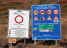 Da wir seit einigen Kilometern keine Menschenseele mehr gesehen haben, studieren wir die Tafel eingehend und lesen im Denzel nach: Ganz oben steht, dass die Offroadstrecke zum Colle Sommelier gesperrt ist und zwar mit Angabe des Landesgesetzes, was in Italien eigentlich ein striktes Fahrverbot darstellt. Sollte bereits hier das Ende unserer Fahrt sein? Allerdings gibt darunter eine mehrsprachige Tafel darüber Auskunft, dass die Offroadstrecke befahren werden darf und zwar so lange kein Schnee liegt bis Ende Oktober.