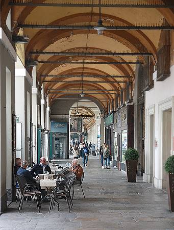 Am Nachmittag fahren wir ins nahe gelegene Cuneo, um die Altstadt zu erkunden: Wir sind mächtig überrascht, als wir auf den Hauptplatz kommen, der rundherum mit großen Laubengängen eingefasst ist.