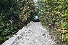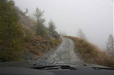 Meine Beifahrerin protestiert deutlich und ich möchte mir nicht vorstellen, wie es wäre, die Straße wieder bergab fahren zu müssen. Schließlich haben wir das erste Steilstück überwunden und schrauben uns in dichtem Lärchenwald Meter um Meter nach oben. An einigen Stellen bekommt der Lack unseres Land Rovers einiges an Buschwerk zu spüren, Ausweichen unmöglich! Auch ein paar kleine Brücken müssen überwunden werden. Die Betonstempen sind derart eng gesetzt, dass ich froh bin, mit den Außenspiegeln oben drüber zu kommen.
