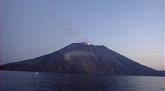 Das sieht dann in der Dämmerung aus wie im Bild unten links: Das passiert nun neben größeren Ausbrüchen seit mehreren Jahrtausenden. Wenn man im Ort Stromboli selbst in einem Café sitzt, mag man gar nicht glauben, dass das nur zwei Kilometer entfernt auf dem Gipfel ständig so abläuft. Wenn man nicht weiß, was sich dort oben dauernd tut, bekommt man nichts davon mit ...