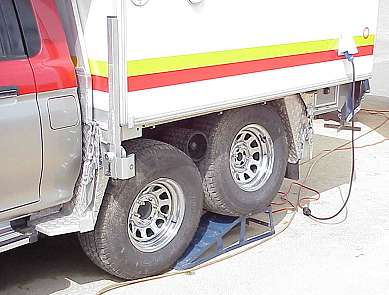 Bei näherem Hinsehen ist zwischen den Hinterrädern eine Reibrolle erkennbar, die folgende Funktion hat: Hydraulisch abgesenkt wird die Reibrolle durch den Druck der 3,5 Tonnen schweren (!) Kabinenladung und so zwischen die Räder gepresst, dass dies zu einer Kraftübertragung auf die nicht angetriebene Nachlaufachse führt: Eine Art 6x6-Antrieb entsteht auf diese Weise. Bei der Fahrt auf normalen Straßen kann dieser "Zusatzantrieb" dann wieder "abgeschaltet" werden durch Anheben der Reibrolle.
