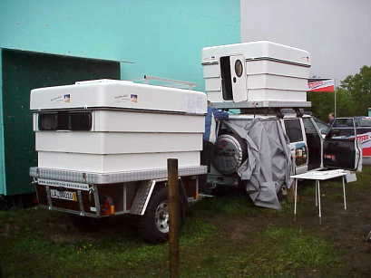 Bereits bei der CBR 2001 war sie uns aufgefallen, die neue Lösung: Bernhard Finck von der gleichnamigen Firma für Campingsysteme hatte im Winter 1995-1996 die Idee, durch einen teleskopförmigen Wandaufbau eine bequeme und praktische Übernachtungsmöglichkeit zu entwickeln. Mehr Kabine als Dachzelt, sollte sie zwei Personen genügend Platz und einen guten Schutz vor Wind, Regen und Kälte bieten.