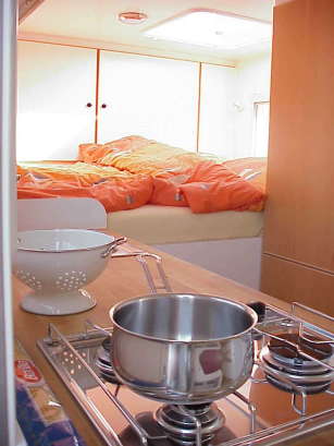 Etwas, was uns weiter auffiel und wir zunächst kaum glauben konnten, war allerdings etwas anderes: Nicht eine einzige Steckdose entdeckten wir in dem mit Weinflasche und apricotfarbener Bettwäsche ausgestattetem Weltreisemobil - wie will man hier eigentlich Berichte von unterwegs mit seinem Laptop schreiben, mit FUGAWI seine Routen plotten und das GPS mit Waypoints versorgen? Und dann natürlich noch die Besucherfragen nach einem Fernsehanschluss ...
