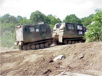 Mit allen erdenklichen fahrbaren Untersätzen kann man ins Gelände: Da sind zum einen die Geländewagen von Hyundai, wie wir bei unseren Nachbarn berichtet haben, aber auch ein Kettenfahrzeug mit Anhänger (Hyundai-Animateur: "Hobbypanzer") brettert mit viel Staubentwicklung über die Pisten ...