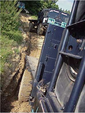 Auch wir können nicht widerstehen und bekommen als Bonus noch eine Fahrvorführung erster Klasse: Innerhalb des Parcours gibt es eine Strecke, in der die Trucker zeigen können, was die Trucks so drauf haben. Wir klettern steil hinauf, verschränken ohne Ende, stehen auf 3 Rädern im Gelände (siehe Bild), kriechen "mit der Nase" über den Lehm und lassen uns richtig durchschütteln.