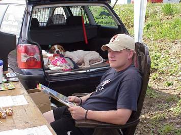 Nun bevökert sich auch der weiße, verlassene Pavillon neben uns: Sascha Seitz von der mobilen Hundeschule zieht ein zusammen mit Hündin "Ilka von den wilden Franken". Saschas Fachgebiet ist die "Erziehung von Hunden" und sein Konzept scheint ganz einfach: Er kommt zu seinen Klienten nach Hause und erzieht im wesentlichen den Hundebesitzer. Mit der richtigen Hundepsychologie, "ohne Druck und ohne Leckerli" schweißt er Hund und Mensch zu einem Team zusammen. Ungläubige Hundebesitzer werden eines Besseren belehrt: Wir beobachten, wie ein Jagdhund mit ausgeprägten Schlittenhundqualitäten innerhalb von einer Viertelstunde brav neben seinem Herrchen geht ohne zu ziehen. Das Herrchen ist so begeistert darüber - denn der Hund war ja angeblich ein hoffnungsloser Fall -, dass wir ihn noch lange Zeit immer wieder stolz vorbei gehen sehen. Wahrscheinlich wagt er sich nur nicht hinzusetzen, aus Angst der Zauber wäre dann vorbei ...