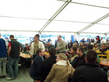 Müde vom Rundgang erwartet die Besucher ein großer überdachter Biergarten, in dem allerlei gebrutzelt wird und wo man mit dem einen oder anderen Bier von all dem Gesehenen träumen kann. Jeden Nachmittag findet hier eine große Verlosung statt. Es macht immer wieder Spaß, der Conference von dem stets gut gelaunten Animateur von Hyundai und Gottfried Krassa zuzuhören. Am letzten Tag hat eine junge "Nachwuchsfahrerin" den Hauptpreis gewonnen: Sie ist nun Herrin über ein Quad im Wert von 5000,- EUR. Herzlichen Glückwunsch!