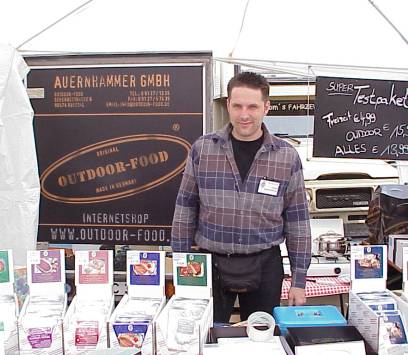 Und da wir gerade beim Essen sind: Auch Erhard Auernhammer ist wieder da - zwar an einem anderen Platz - aber mit seinen unverändert leckeren Spezialitäten: "Outdoor-Food", über die wir ausführlich berichtet haben und die ihre Bewährungsprobe bei Island 2003 bestanden hat. Wir nutzen die Chance und decken uns wieder ein für unseren bevorstehenden Estland-Trip.
