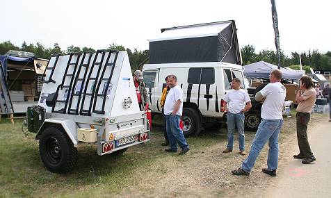 Die interessanten Kisten auf ihrem Stand, die auch als Maßanfertigung angeboten werden, wecken sofort unsere Aufmerksamkeit: Sind sie doch fast "Zwillinge" unserer "Kanisterkisten", die wir einst im Nachtrag vom Mai 2003 vorgestellt hatten - klar, dass wir den Nachbarn von den Ungenauigkeiten erzählen, die uns damals unsere "maßgeschneiderten" Kisten etwas verleidet hatten. Man versichert uns, dass dies bei 4x4 MAXE selbstverständlich nicht passiert wäre und wir sind drauf und dran, nochmal wirklich passendes zu ordern ...