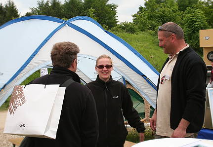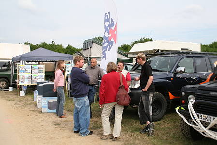 Wir kommen natürlich gut aus mit unseren Nachbarn und selbst als während der Messetage humorige Besucher des Nachbarstands beim Flattern der dicht daneben an Kurt´s Landy befestigten Explorer Magazin Flagge angeblich "Ohrenkrebs" zu bekommen drohen, bricht keine Panik aus - bei dieser Messe überwiegt die gute Laune bis zur letzten Minute.