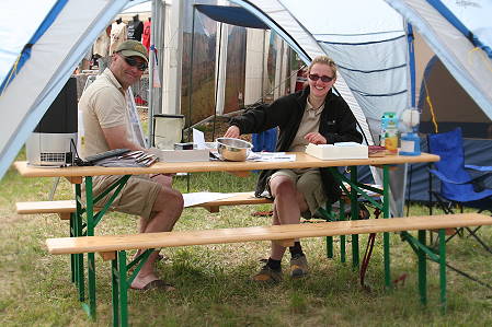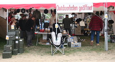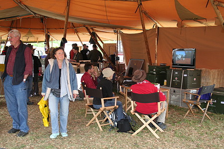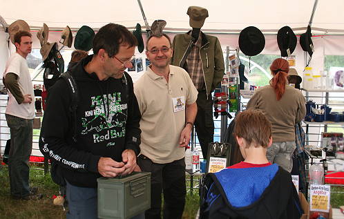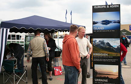 Unsere Nachbarn von gegenüber erweisen sich als freundliche Mannschaft, mit denen man leicht ins Gespräch kommt. Zwei große, luftige Tipis sorgen für eine angenehme Atmosphäre, in der sowohl verkauft wird als auch regelmäßige Vorführungen stattfinden, so z.B. eine Multivisionsshow zur "Canning Stock Route" in Australien oder ein Filmvortrag zu einer Ukraine-Reise.