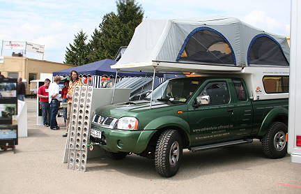 Robby ist am Stand mit seinem grünen Nissan Pickup vertreten und dieser trägt ein Hardtop, das uns aus früheren Jahren noch gut bekannt ist: In Heft 10/1995 der OffRoad wurde unter Überschrift "Camping auf der Pritsche" ein Testbericht gebracht zum Flip-Pac Hardtop-Dachzelt von Road Ranger sowie dem Aero-Plast Explorer. Abgebildet in dem Artikel ist auch der Regenüberzug zum Flip-Pac, der allerdings bei Regen ein riesiges nasses Teil beschert, das erst einmal irgendwo weggepackt werden will. Für Reisen in südliche Gefilde ist das Flip-Pac dagegen sicher ein interessantes historisches Teil, das von Robby und Adventure Offroad da ausgegraben wurde - wir sind gespannt auf künftige Erfahrungsberichte!