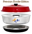 Er besteht aus nur drei Teilen: einem schwarzen Stahlring, einer Form aus Aluminium und einem Deckel. Der untere Stahlring kommt direkt auf die Gasflamme bzw. die Herdplatte. Die Form aus Aluminium ist ähnlich einer Guglhupfform: Dort wird der Teig hineingefüllt und dann wird sie auf den unteren, schwarzen Ring gesetzt. Dieser schafft den Abstand zwischen Flamme und Backform und verhindert somit zu hohe Unterhitze. Gekrönt wird das Ganze schließlich durch den roten Deckel ...