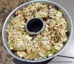 Wenn der Teig eingefüllt ist bzw. die Zutaten für den Auflauf eingeschichtet sind und der Deckel sitzt, heize ich den Omnia für zwei Minuten auf höchster Flamme an und stelle dann zurück auf die kleinste Flamme. Wichtig ist, dass der Backofen mittig auf der Flamme steht!