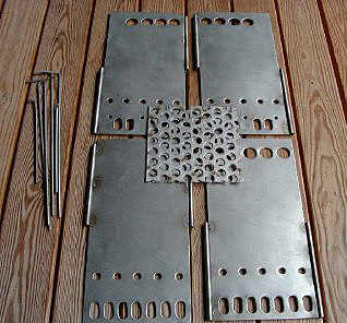 So bestand dann der Ofen aus 4 Seitenteilen, einem losen Rost und einigen Stäben aus 4 mm V2A. Das ließ sich sehr klein und flach verpacken und war trotzdem schnell zusammengesteckt. Dieses Modell fertigte ich aus Stabilitätsgründen aus 1,5 mm V2A Blech an, und ich benutzte nun eine hydraulische Stanze, um die Bleche mit den entsprechenden Löchern zu versehen. Das sah alles sehr sauber aus und schien mir schon fast perfekt. Auch zusammengebaut sah der Ofen sehr gut aus.