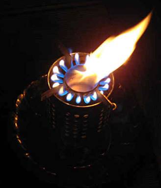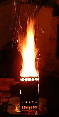 Feuer und Wärme. Im Brennraum ist ein V2A Behälter mit etwa 0.8 Liter
