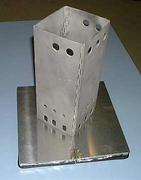 Ich hatte auch schon einige Anfragen von Paddelkameraden bezüglich des Ofens und wenn ich so an die Umstände der Herstellung dachte ... das musste doch einfacher zu machen sein. Ich hatte schon einmal mit dem Gedanken gespielt, den Ofen eckig zu machen, und dabei kam mir dann auch gleich die Idee, dass es ja möglich sein müsste, das dann auch gleich so zu bauen, dass man ihn zusammenlegen/falten kann. Ich fertigte ein paar Modelle aus Pappe an und entschied mich dann - nachdem ich erfahren hatte, wie teuer Scharniere aus V2A sind - für eine Variante, bei der ich die Scharniere durch angeschweißte Steckhülsen ersetzte. In diesem Fall einfach Abschnitte von 8 mm V2A Röhrchen.
