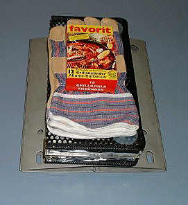 Scharniere an allen Ecken, also nur vier Stück anstatt sechs, und man kann dann nach Hochklappen des Rostes und des Stützblechs, das den Rost gegen den Boden abstützt, den Ofen so zusammenlegen, dass er nur noch etwa 1 cm dick und zwei Seitenteilbreiten misst. Das Ganze ergibt also ein Päckchen von 31 cm x 25 cm x 1 cm.