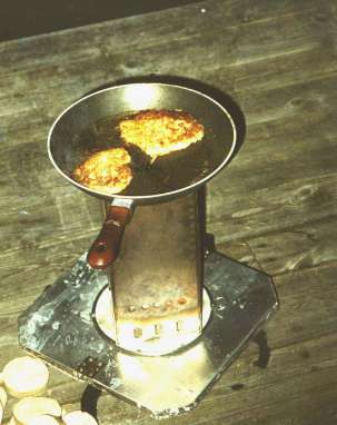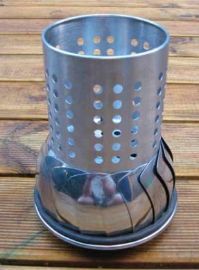 Die Brennkammer ist thermisch vom Unterteil getrennt und dieses wird auch nach längerer Zeit nur mäßig heiß. Auf den Bildern fehlt noch die Isolierung zwischen Brennkammer und Unterteil. ... Im Moment tüftele ich an einer auch zusammenfaltbaren Haube aus V2A für den Ofen, die im Zelteinsatz verhindert, dass stärkere Funken aufsteigen. Sieht bislang ganz gut aus.