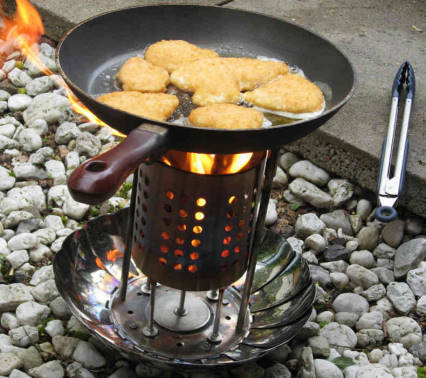Ebenso als Ofen in einer skandinavischen Lavvu perfekt: Er besteht aus einer Brennkammer mit angebautem, zusammenlegbarem Bodenschutz, einem Einsatz, mit dem man einen Spiritusbrenner einsetzen kann wenn mal Holzfeuer nicht angesagt ist, und der Topfhalterung, die nur bei Bedarf angesteckt wird. Er sieht auch optisch als Lagerfeuer viel besser aus. Das Unterteil besteht aus hochwertig glanzverzinktem Stahl und die Brennkammer aus Edelstahl mit erhöhtem Eisenanteil.