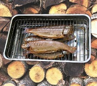 den Räucherofen kommt die erste Forellenlage auf einem Gitter rein,