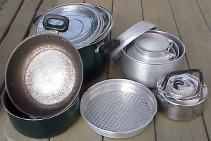 Da gibt es zunächst die ganze Palette der Alukochsets. Sie sind schön ineinander zu stapeln und wiegen wenig, da sie dünn sind. Speisen, die Säure enthalten, sollte man besser nicht darin kochen, da die Säure das Aluminium anlöst und an die Speisen abgibt. Die Griffsysteme (häufig Zangengriffe) erfordern etwas Übung, will man sich beim Ausschütten nicht am Topfinhalt verbrennen. Die Wärmeleitung ist zwar perfekt, aber die gleichmäßige Wärmeverteilung und Wärmespeicherung aufgrund der dünnen Böden so schlecht, dass der Topfinhalt schnell anbrennt. Das Reinigen erfordert Muskelkraft, auch wenn man sich mit einem Päckchen Backpulver die Arbeit etwas erleichtern kann. Für den Rucksackwanderer sind die Töpfe ok, aber ansonsten ist bei uns die blanke Alukocherei ad acta gelegt ...