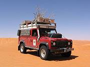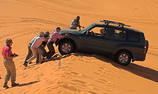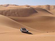In der Sandwüste des Idhan Ubari erlernen wir relativ schnell das richtige Queren von Dünen: Immer mit Schwung und gefühlvoll geht es hinauf, mit Motorbremse und in gerader Fallinie auf der anderen Seite hinunter. Um das Eingraben der Räder zu verhindern, fahren wir mit reduziertem Luftdruck. Bei 1,3 Bar vergrößert sich die Auflagefläche der Reifen schon deutlich und der Wagen sinkt nicht mehr so schnell ein. Hat man den richtigen Dreh erst einmal raus, verlieren selbst unüberwindlich scheinende Dünen ihre Schrecken.