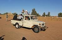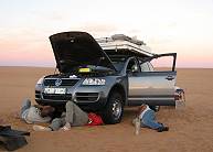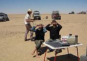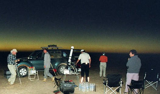 Weniger Glück hat der Besitzer eines anderen Geländewagens: Ein Motorschaden bedeutet das vorzeitige Ende für seinen Offroader. Das Fahrzeug muss mehrere Tage am Seil durch die Wüste gezogen werden. Unser Pajero und der L 200 bleiben glücklicherweise von Pannen verschont. In der Dämmerung des Vorabends zur Finsternis erreichen wir erschöpft und müde die vorausberechnete Position für die Sonnenfinsternis.
