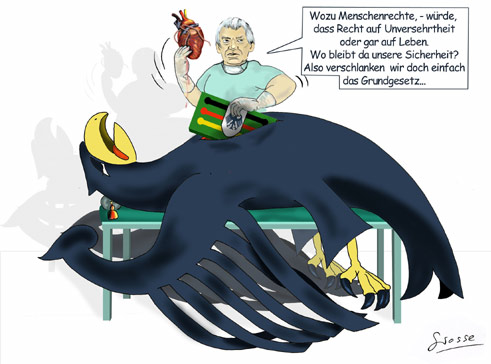 An zahlreichen Baustellen wird mit dem Argument der Sicherheit oder der sozialen Gerechtigkeit an den Grundrechten der Bürger geknabbert - besser gesagt diese werden im Maßstab des Braunkohletagebaus industriell abgebaggert. Da, wo beide Argumente - also Sicherheit und soziale Gerechtigkeit - zusammentreffen ergeben sich die härtesten Einschnitte: