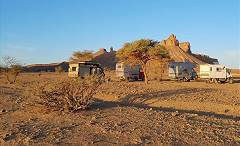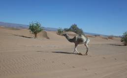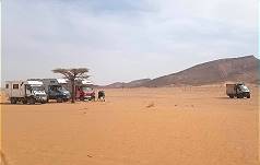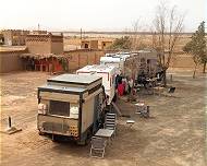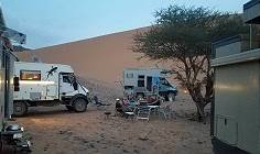 Damit haben wir nun das Kapitel "Steinwüste" abgeschlossen und brechen auf zu einer neuen Wüste, der Sandwüste und Dünenlandschaft im Süden des Landes. Bis nach Merzouga und den hohen Dünen des Erg Chebbi sind es zwar noch einige lange und holprige Kilometer, aber wir düsen nonstop durch und sind am frühen Abend schon bei der Auberge mit Camping La Gazelle Bleue, wo wir uns mit den drei anderen Fahrzeugen, Bremach, Iveco und Benz treffen.