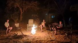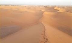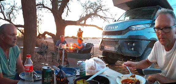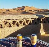 Da er sehr verständlich Englisch spricht, wird es eine lange Unterhaltung mit vielen Einblicken in sein Leben und Überleben dort in der immer trockener werdenden Wüste. Aber seinem dringendsten Wunsch wollen wir wirklich nicht entsprechen, unser Nachtplatz direkt unter der hohen Düne ist einfach genial. Fast schon traurig klingt seine Frage: "Ja, wovon soll ich denn leben?" Diese ehrliche Offenheit berührt uns schon und wir versprechen ihm, morgen zum Frühstück in seine Auberge zu kommen und handeln gleich einen sicher unüblich hohen Preis aus. 40 Dirham soll er bekommen pro Person, insgesamt also knapp 40 Euro einnehmen. Da ist Muhammed zufrieden, schiebt noch zwei Dosen Bier in die Taschen seines Berberumhangs und fährt wieder heim ...
