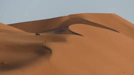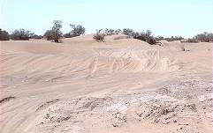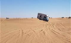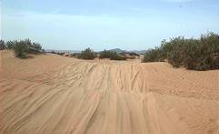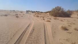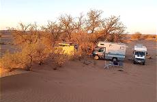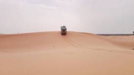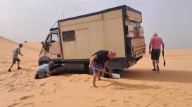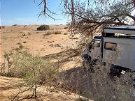 Die nächsten zwei Tage vertrödeln wir, haben Zeit für Dünenwanderungen, Wäsche waschen und Spaziergänge zur Ortsmitte. Später suchen wir uns in der Nähe ein kleines Dünenfeld für Fahrübungen, nur mit unseren zwei, etwas leichteren Bremachs. In meinem Fahrzeug sitzen wir zu dritt und jeder darf einmal einige Kilometer ans Steuer, um ein Gefühl für das Sandfahren und Gleiten über niedrige Dünenkämme zu bekommen. Über die kleinen Buckel hüpfen wir ohne Probleme, aber als Roland am Steuer sitzt, fallen ihm die gestrigen Quads wieder ein und er steuert mit Vollgas eine deutlich höhere Düne an ...
