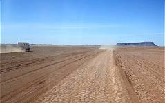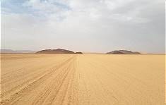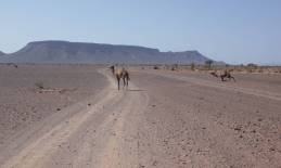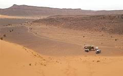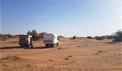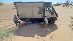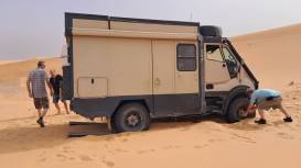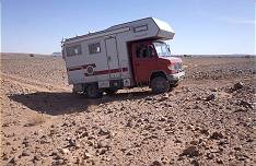 Nach dieser lehrreichen Übung wagen wir uns auf die bekannte Piste von Merzouga Richtung Zagora, die in ca. 25 km Entfernung etwa parallel zur algerischen Grenze verläuft. Die knapp 20 km bis Taouz sind längst asphaltiert und die Piste danach fast ohne Herausforderung für Allradfahrzeuge. Auch die Orientierung ist denkbar einfach, wir fahren genau auf dem Track SMZ des Pistenkuh-Führers. Nur einmal queren wir eine drei Kilometer breite Schwemmtonebene mit einigen Querrillen, wie wir sie von der Steinwüste schon kennen, diesmal aber tiefsandig. An einer dieser Stellen hat der Mercedes Vario von Stefan und Renata Probleme, vielleicht hatten sie zu wenig Schwung. Aber durch Luftablassen und beherztes Gas geben klettert der 7,5 Tonner ohne fremde Hilfe schließlich doch hinüber ...