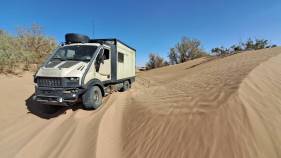 Was haben wir gelernt dabei: Eine hohe Düne muss sich wenigsten einer vorher angesehen haben. Und man braucht Sandbleche unter allen vier Rädern, zwei davon nutzen überhaupt nichts. Acht Bleche wären noch besser, dann könnten sich alle Räder von Blech zu Blech hangeln. Ja klar, eine komplette Blechspur beidseits wäre … langweilig. Was wir schon wussten, nur vergessen haben: Ein Bremach ist kein Quad!