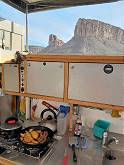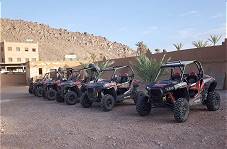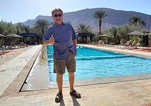 Das Kochen mit Blick auf unser Wanderziel für den nächsten Tag und ein gemütliches Zusammensitzen bei angenehmen Temperaturen genießen wir ungestört. Am nächsten Tag fahren wir noch gemeinsam zu einer luxuriöseren Übernachtung auf dem Stellplatz vor dem Hotel Bab Rimal, dem angesagtesten Platz in Foum Zguid. Hier gibt es für 12 Euro, also etwas mehr Geld als sonst, ein echt gutes Menü und einen großen Pool mit kühlem und sehr sauberem Wasser: Was für eine Wohltat, aber auch ein toller Luxus am Wüstenrand. Das Hotel ist gut besucht von Reisenden mit Motorrädern, Geländewagen und geführten Wüstentouren, die mit den schon erwähnten geilen 100-PS Buggys über Stock und Stein, vor allem aber auf die höchsten Dünenkämme düsen und auf den schrägen Hängen sogar kurven können. Wer Motorsport liebt und den Trubel des Massentourismus aushalten kann, ist sicher gut bedient mit dieser Variante, die man für überschaubare Summen buchen kann.