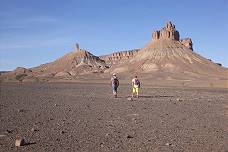 Am nächsten Tag geht es weiter mit dem Surfen im Sand, die Querdünen sind heute aber nicht mehr so hoch und sportlich wie gestern. Später führt eine zum Teil ruppige Piste nördlich am Lac Iriqi vorbei bis etwa 20 km vor Foum Zguid, wo uns Stefan und Renata in ihrem Mercedes entgegenkommen. Gemeinsam fahren wir einige Kilometer den Track SFF und das Tal bis zu den markanten Felsformationen hinein, um dort zu bleiben. Wieder einmal kommen zwei junge Typen auf einem kleinen Motorrad zu uns und wollen irgendwas haben. In erster Linie wollen sie aber Selfies mit unseren Autos im Hintergrund aufnehmen - Instagram lässt grüßen - und verschwinden bald wieder ...