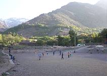 Während die Alpinisten sich zwei Tage lang plagen, mache ich es mir gemütlich im Auto, lese Marokkoführer, schreibe am Tagebuch und schaue den Kids auf dem benachbarten Bolzplatz zu. Ein Spaziergang durch Imlil mit Einkäufen, SIM-Karte verlängern und Imbiss an einer Garküche sorgt für Kurzweil. Beim Versuch, über die Fahrstraße zu Fuß nach Arumd hochzulaufen, finde ich am Ortsausgang von Imlil doch noch eine Campingmöglichkeit, jedenfalls für maximal drei niedrigere Fahrzeuge wie normale Geländewagen. Das "Dar Tizi Mizik" bietet auch "Gite" (Franz.: Ferienunterkunft) und Restaurant. Na ja, eine Tajine wird es halt geben. Weiter hoch gehe ich aber nicht und beschließe, mir für den nächsten Tag ein Taxi nach oben zu organisieren und dann bergab auf anderen Wegen zu laufen ...