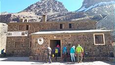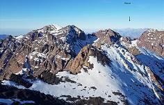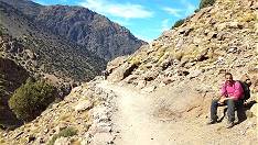 "Gegen 7 Uhr und noch bei Dunkelheit starteten wir und marschierten schnellen Schritts erst noch mit einigen anderen Touristen und Mulitreibern einen Schleichweg zum vier Kilometer höher gelegenen Arumd hoch und von dort den 16 km langen Wanderweg bis zur Hütte auf 3.200 Meter Höhe. Aufgrund des schnellen Vorankommens und der frühen Ankunft am "Refuge Les Mouflons" schlug Mohammed vor, noch am selben Tag den Gipfel zu besteigen. In Ermangelung einer Pause und der fehlenden Jause wurde diese Idee von mir aber verworfen, auch weil ich insgeheim spekulierte, einen Sonnenaufgang am Grat oder am Gipfel des Toubkal erleben zu dürfen.
