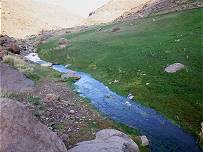 Deshalb stehen wir am nächsten Tag wie vereinbart kurz nach 7:00 Uhr vor der Auberge, nein Baustelle von Abdellah, und marschieren gemeinsam los. Ich kann das Tempo der beiden "Rennziegen" aber nicht halten und gehe mit zunehmendem Abstand mehr als zwei Stunden lang hinterher. An einigen Pflanzterrassen für den Safrananbau vorbei und entlang eines kleinen Bächleins, das von saftigem Grün umgeben ist, geht es auf guten Steigen gemütlich in die Höhe.