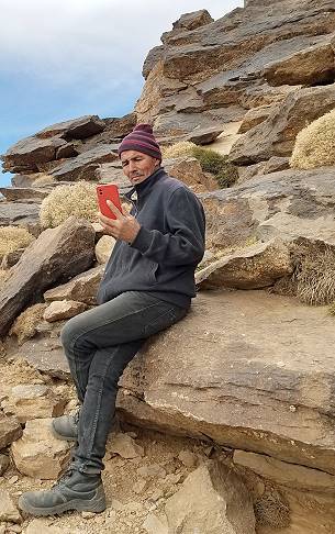 Im Vergleich zum Jebel Toubkal ist der Jebel Siroua eher unbekannt und somit auch einsamer. Erneut begleitete unseren Aufstieg zunächst ein rauschendes Gebirgsbächlein, nicht selbstverständlich im marokkanischen Bergland. Aufgrund der Vielzahl an Wegspuren, die vermutlich alle Richtung Gipfel führten, war ich jetzt im Nachhinein aber froh, dass Sepp so vehement auf einem Guide bestanden hatte. Allein wäre die Wegfindung mit meinem altersschwachen Handy sicherlich abenteuerlich geworden. Abdellah nutzte als Berber des 21. Jahrhunderts die "monotonen" Gehzeiten am Berg, um mit seinem Handy die Arbeiten zur Aufstockung seiner Auberge zu koordinieren, Mailboxen abzuhören, mit der Familie zu sprechen oder im Internet zu surfen. Das ständige Glotzen auf den kleinen Touchscreen wurde in regelmäßigen Abständen von Berbergesängen unterbrochen. Den Pfad finden und darauf entlang spurten konnte er fast blind. Nach drei Stunden strammen Marschierens musste ich eine kurze Pause aushandeln, obwohl unser Tagesziel immer noch nicht sichtbar war. Diesmal hatte ich nämlich meinen Proviant nicht vergessen.