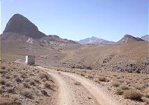 Das Kapitel Siroua ist erledigt, meinen wir und brechen auf zur nächsten Etappe Richtung Todra-Schlucht: In Taznakht biegt man dazu nach Norden Richtung Quarzazate ab und kommt nach 30 Kilometer durch Anezal ("Anzel" auf der Regionalkarte oben). Hier geht westlich eine schmale Straße nach Tachokchte ab, die im Pistenkuhführer die Bezeichnung HTA trägt und nördlich am Siroua vorbeiführt. Da ich den Gipfel noch nicht richtig gesehen habe, juckt mich diese inzwischen geteerte frühere Piste, die zum zweiten (nördlichen) Zugang des Siroua führt, und wir machen somit diesen Trip. Nach geschätzt 20 km Teerstraße biegt in der Nähe eines hohen Sendemasten eine unbenannte Piste links ab, der wir so lange genau in Richtung des Gipfels folgen, bis sie sich südlich wendet und am Sirouamassiv vorbeiführt. Wir kommen auf diese Weise bis auf sieben bis acht Kilometer an den Gipfel heran und ich habe mit dem Fernglas einen schönen Blick darauf. Und umgekehrt: Vom Gipfelfoto des Siroua aus ist unser nächster Punkt mit einem schwarzen X markiert.