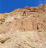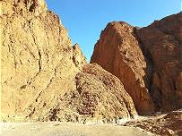Endlich in der Todra-Schlucht angekommen staunen wir nicht schlecht über diese Wände, die an manchen Stellen in zwanzig Meter Abstand voneinander weit über hundert Meter senkrecht hochführen. An vielen Stellen sind schon Kletterer zugange und Roland juckt es in den Fingern: Er hat sicherheitshalber seine Kletterausrüstung mitgenommen und kann mich dazu überreden, die Standsicherung zu übernehmen. Nur haben wir leider einen Helm zu wenig und ich meine, der Vorkletterer müsste den tragen. Aber nichts da, versichert mir Roland, die herabfallenden Steine seien eher das Problem als ein ohnehin nicht stürzender Extremsportler. Also bekomme ich den Helm und meine schon bekannte Glücksfee sorgt dafür, dass er keinen Steinschlag abwehren muss. Aber man soll seine Fee auch nicht herausfordern, richtig? Mehr als eine Seillänge pro Route darf Roland deshalb nicht hoch, damit auch sein Abstieg von unten gesichert werden kann. Schöne Bilder gibt es leider nicht, der eine klettert und der andere braucht alle Hände zum Sichern ...