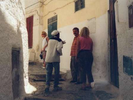 Nur vier Kilometer entfernt ist das Grabmal des marokkanischen Staatsgründers Mulay Idris in der gleichnamigen Stadt. Tagsüber dürfen wir Ungläubigen einige Teile der Stadt betreten, d.h. der heilige Bezirk ist für uns tabu. Die kleine Stadt ist auf einen Hügel gebaut und wie alle arabischen Städte sehr unübersichtlich und verwinkelt, am Marktplatz bietet sich ein Führer an, den wir für ca. DM 10 anheuern.