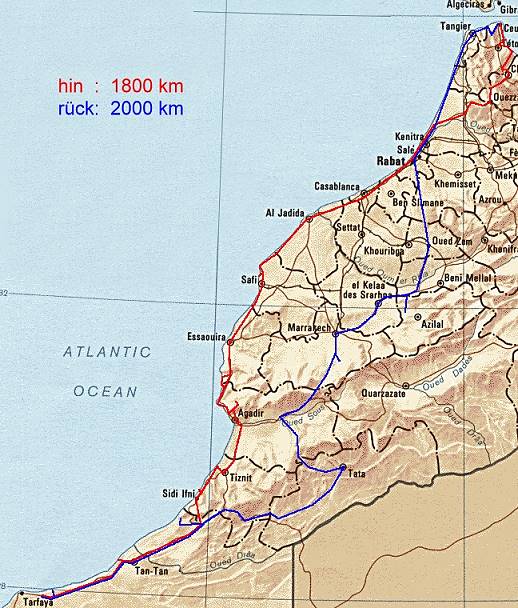 Diesmal allerdings sollte es anders sein als beim letzten Mal: Ein Kastenwagen stand nun zur Verfügung, 19-20 Tage sollte die Reise dauern während der Schul-Osterferien, die projektierte Route: In Südrichtung am Atlantik entlang über Essaouira bis Tarfaya mit dem Schwerpunkt Westsahara. Danach in Nordrichtung über den Antiatlas und Hohen Atlas über Marrakech und Casablanca zurück nach Ceuta.